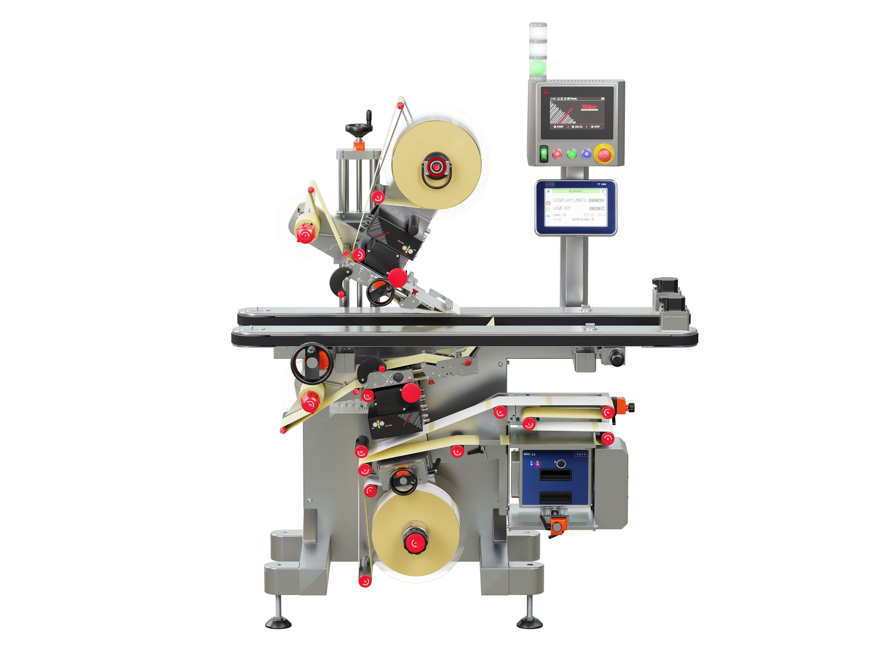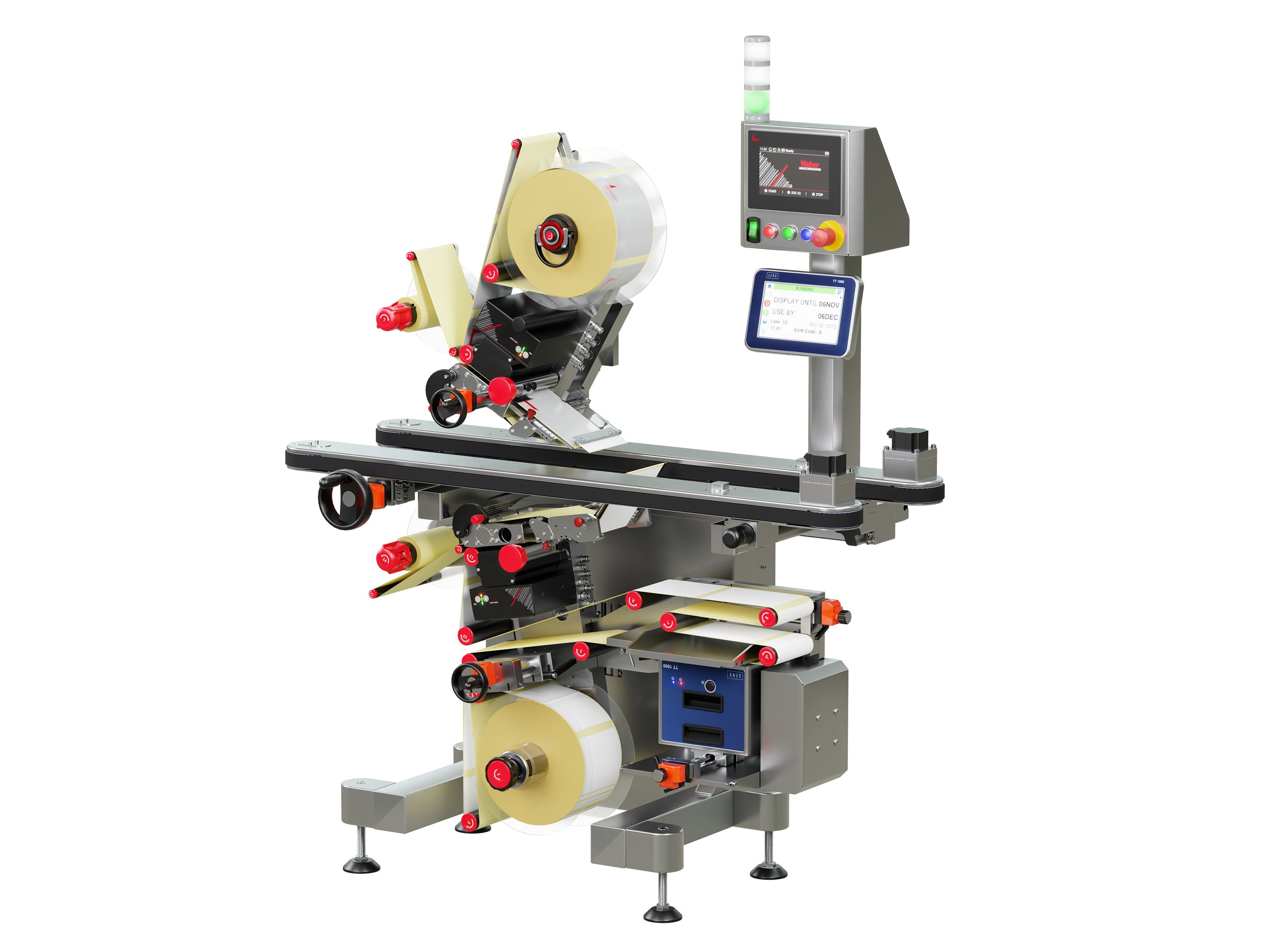 Die CE-konforme Etikettieranlage Geset 247 wurde speziell für maximale Benutzerfreundlichkeit und einfache Integration in bestehende Produktionslinien entwickelt. Die modulare Anlage etikettiert Produkte zuverlässig auf der Ober- und Unterseite. Für einen gleichbleibend stabilen Produktfluss im Etikettierprozess sorgt das integrierte Klemmband. Die Etikettierung übernehmen zwei Alpha HSM Highspeed-Etikettenspender. Dank des zentralen Touchdisplays sowie einer Nahfeldbedienung ist die Steuerung intuitiv – ideal auch für weniger geschultes Personal. Ein schneller Rollen- und Formatwechsel reduziert Stillstandszeiten und erhöht die Flexibilität.
