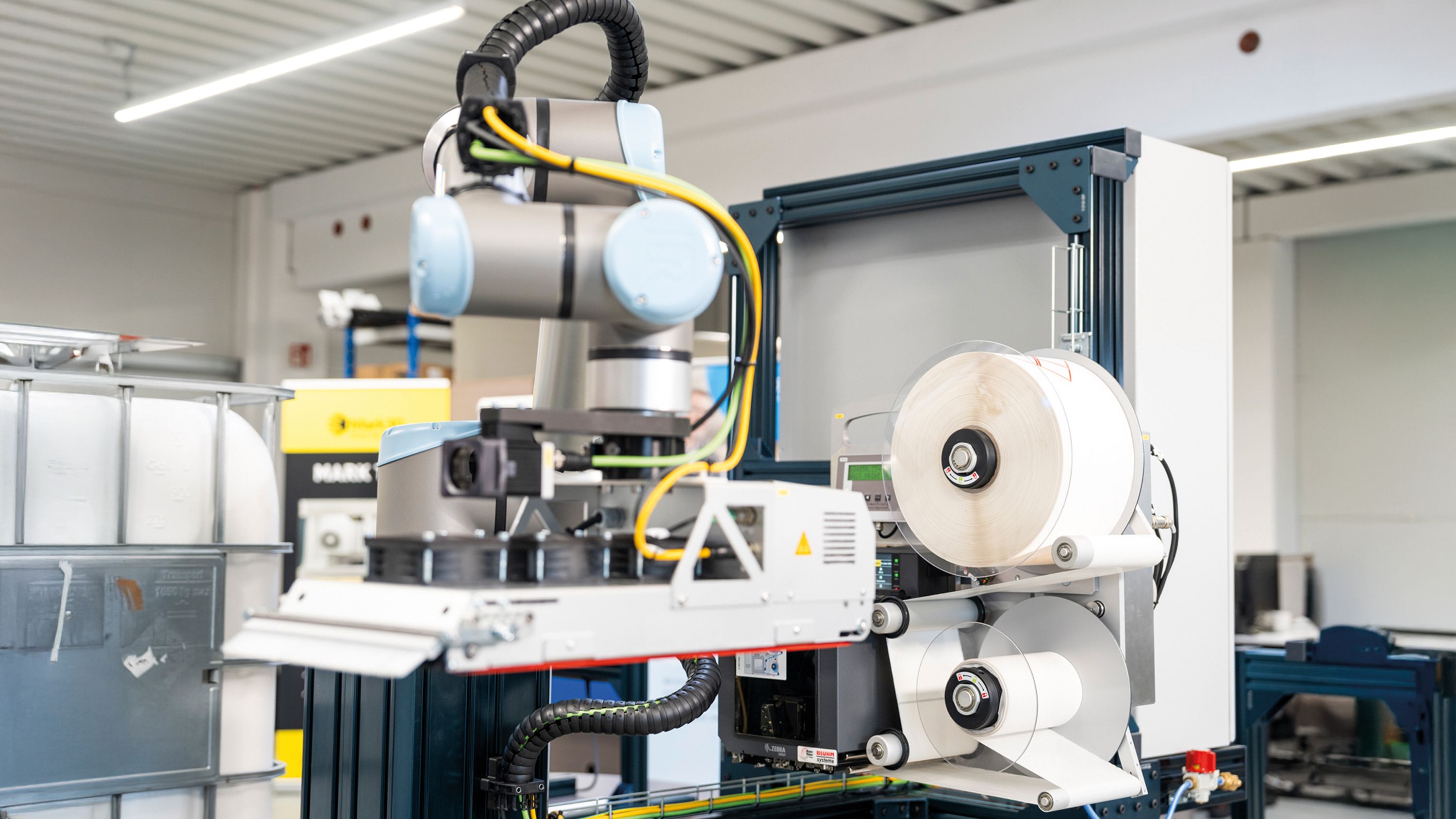 Der Legi-Air 4050B-R arbeitet mit einem Roboter, der über einen individuell gestalteten Applikationsstempel verfügt. Dieser verfährt in die Aufnahmeposition vor dem Druckspender, löst den Druckvorgang aus und übernimmt das frisch bedruckte Etikett. Anschließend bringt der Roboter das Etikett exakt an die zuvor definierte Position auf dem Produkt auf. Dieses Zusammenspiel von Druckspender und Robotik gewährleistet eine hochpräzise, wiederholgenaue Etikettierung – auch bei komplexen Produktgeometrien oder schwer zugänglichen Stellen.