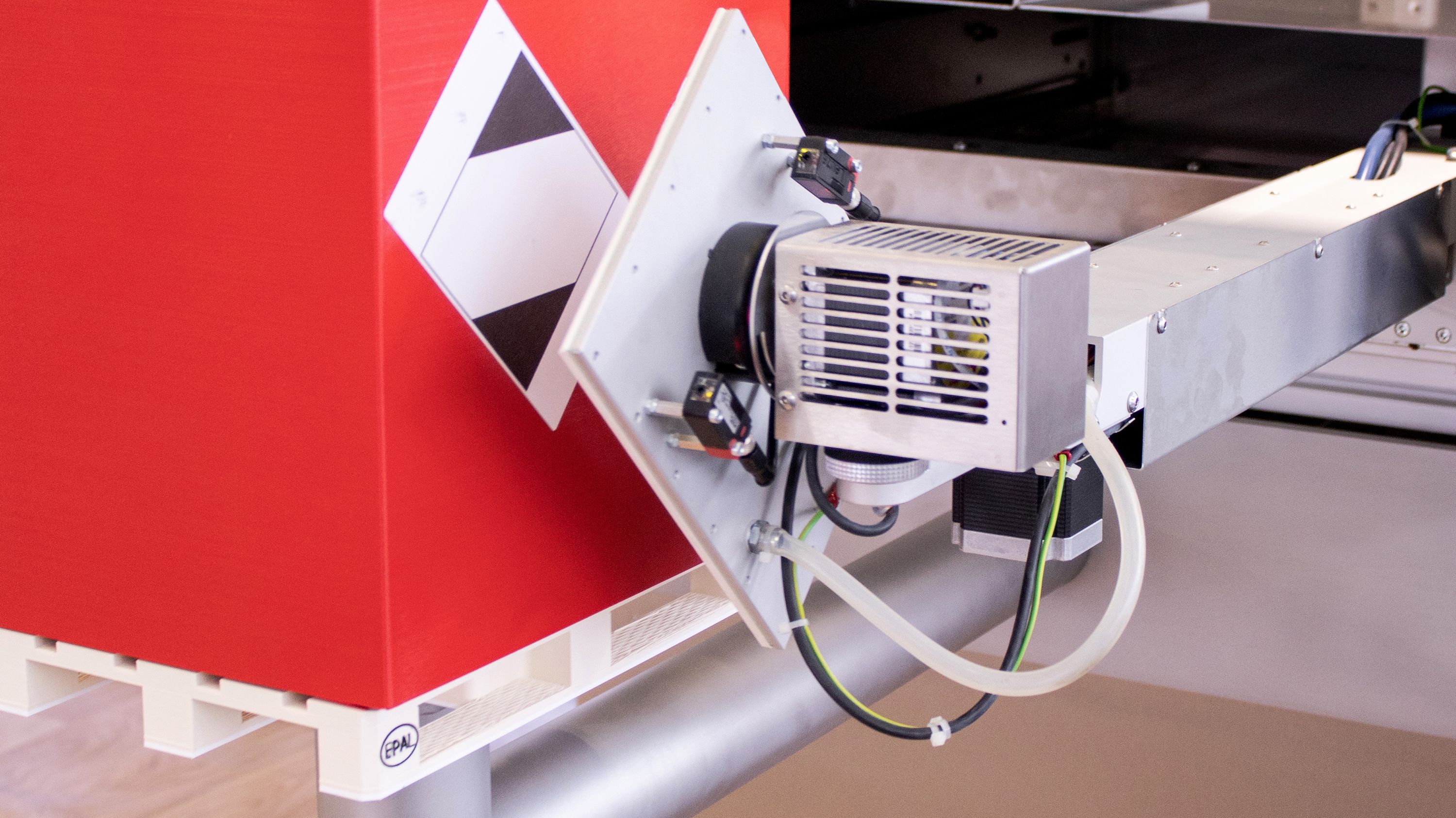 Das System verfügt über einen flexibel schwenkbaren Applikatorkopf, der DIN A5- oder A6-Palettenetiketten wahlweise im Längs- oder Querformat aufbringen kann. Die individuell bedruckten Etiketten werden entweder per Luftstoß aus kurzer Distanz oder über direkten Kontakt mit einer federnd gelagerten Spendeplatte präzise appliziert. Selbst in nur 250 mm schmalen Lücken ist eine Stirnseiten-Kennzeichnung möglich. Zudem etikettiert das System GS1-konform an bis zu drei Palettenseiten und kann – im Gegensatz zum AP182 – Etiketten auch diagonal platzieren, etwa für Gefahrgutkennzeichnungen.