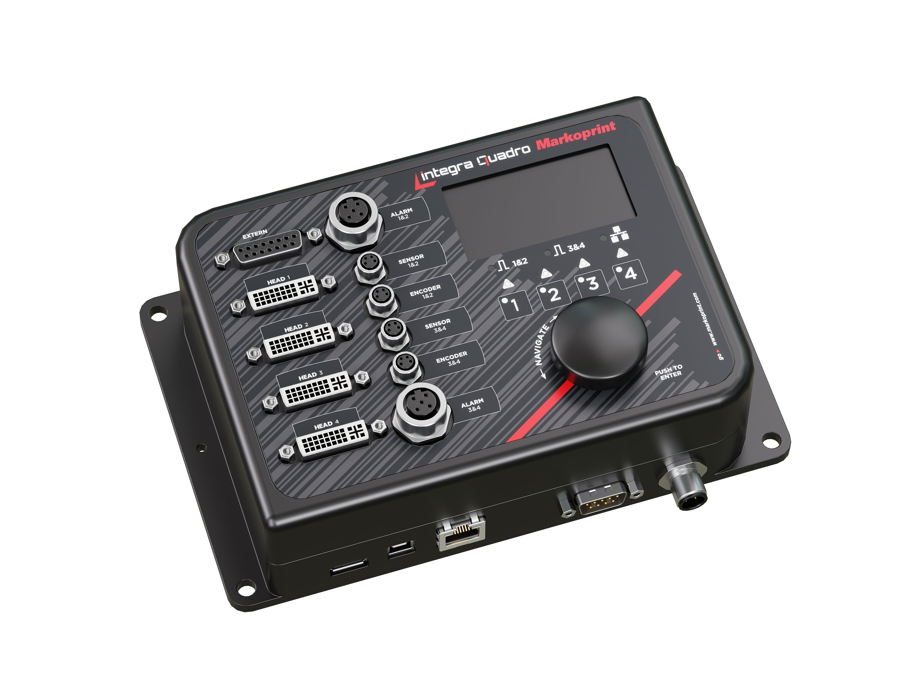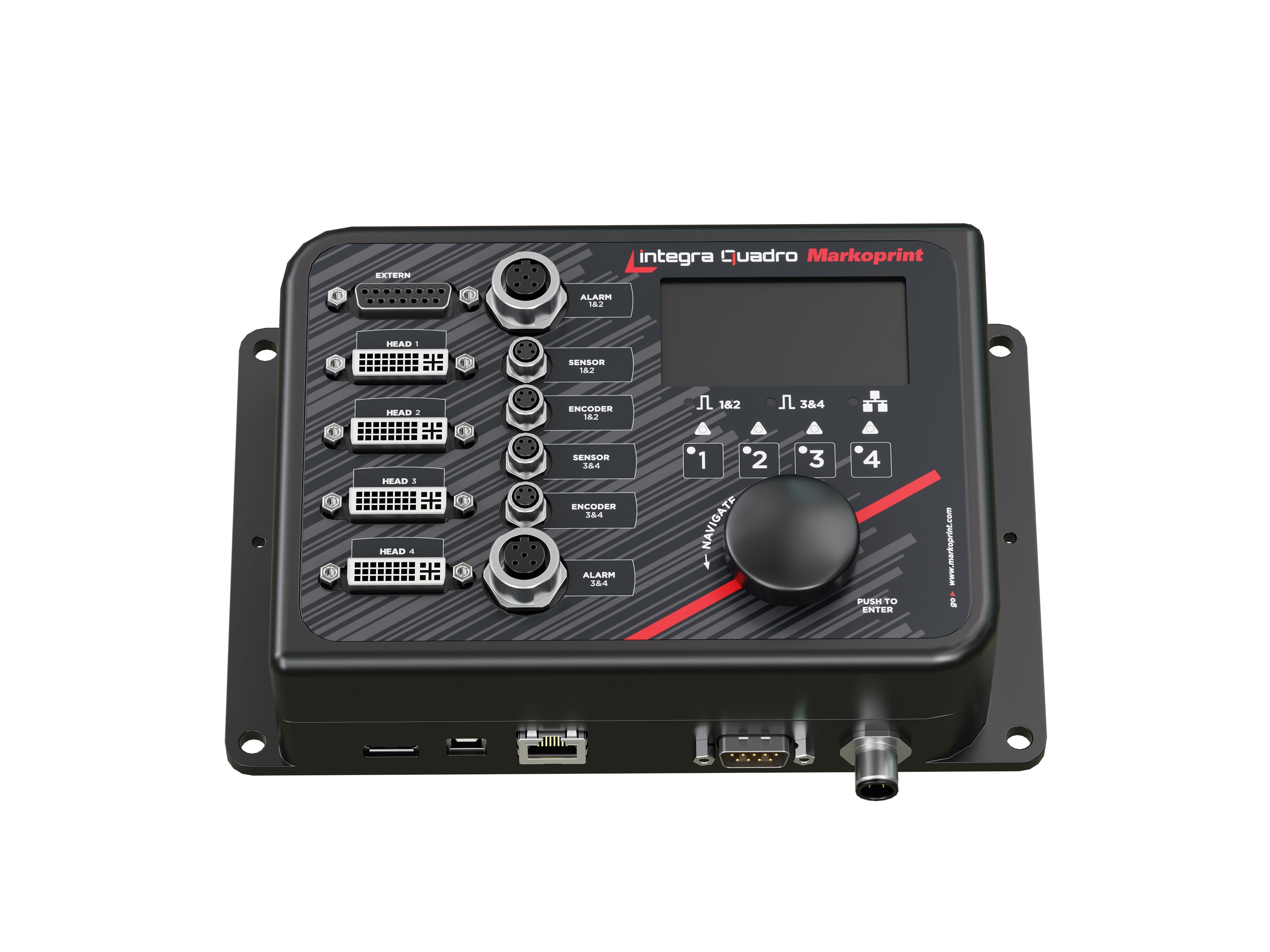 Der Controller Markoprint integra Quadro ist leistungsstark und flexibel zugleich: Er kann bis zu vier Druckköpfe steuern, entweder zeitgleich für parallele Anwendungen oder im Wechsel für unterschiedliche Druckaufträge. Dabei unterstützt er sowohl thermische als auch piezoelektrische Druckköpfe, was eine große Bandbreite an Einsatzmöglichkeiten eröffnet. Durch diese Vielseitigkeit eignet sich der Controller optimal für verschiedenste Produktionsumgebungen und individuelle Kennzeichnungsanforderungen.