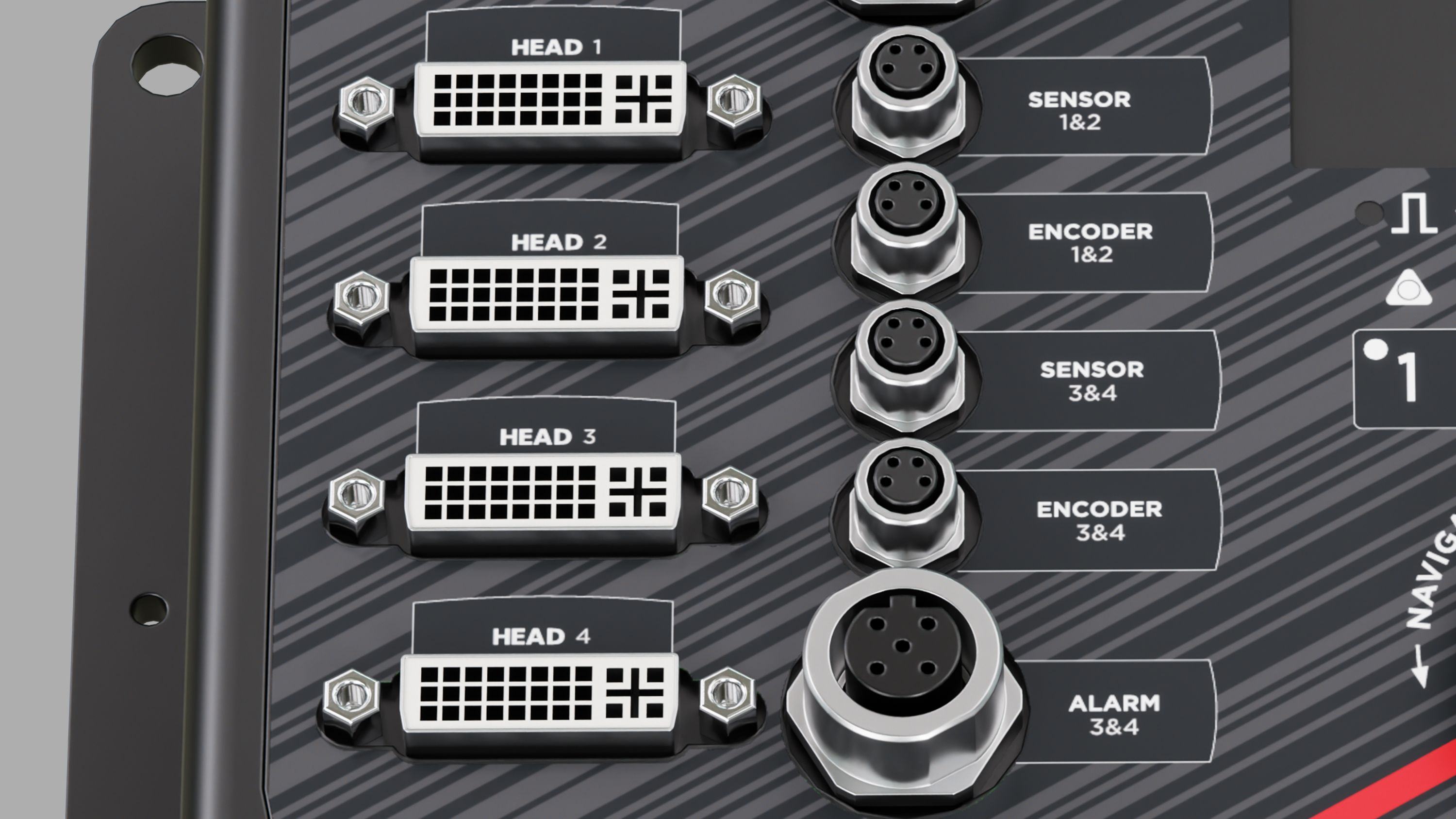 Ethernet (TCP/IP), RS-232, USB (Übertragung Layouts, Änderungen Einstellungen), USB-B Anschluss, M8 Connector für Drehgeber und Sensor, M12 Connector für PoE und Ein- und Ausgänge